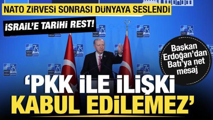 NATO Zirvesi’nde tüm devlet ve hükümet başkanları ile Gazze’de yaşanan katliamı görüştüğünü söyleyen Cumhurbaşkanı Erdoğan, “İsrail’e askeri desteğin sürdürülmesi kabul edilemez. İttifakımızın temel değerlerini ayaklar altına alan İsrail yönetiminin NATO ile ilişkisini sürdürmesi kabul edilemez. Bu alanda girişimler Türkiye tarafından onaylanmayacaktır” dedi.